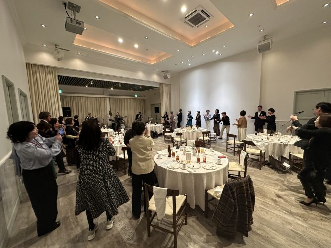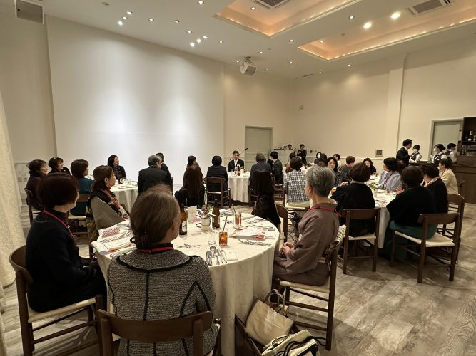 中村弥生会長の挨拶、来賓紹介、村田典子副会頭のご挨拶、乾杯と続きしばらく歓談と食事の時間となりました。各テーブルにて写真撮影なども行われました。
