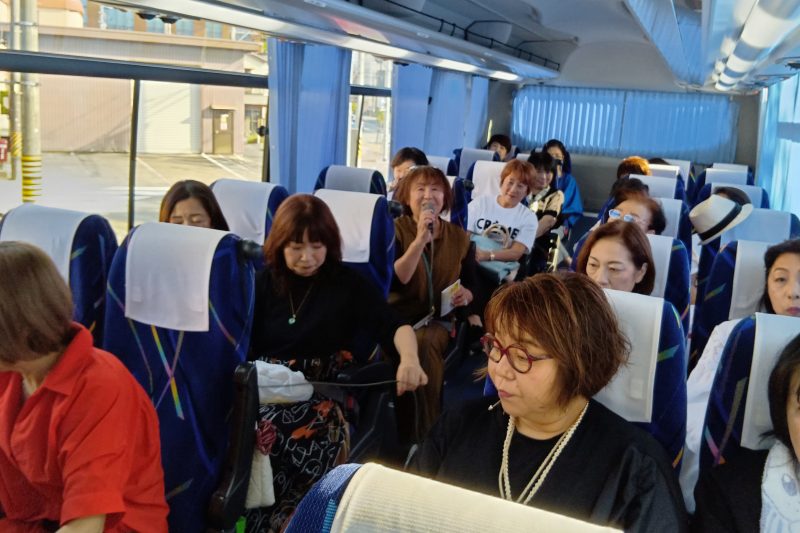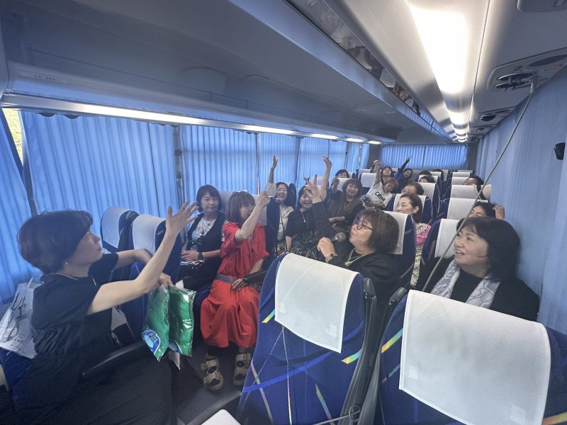 ワイワイと賑やかなバスの中、1分間の自己紹介タイム。