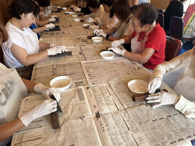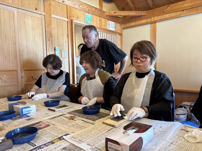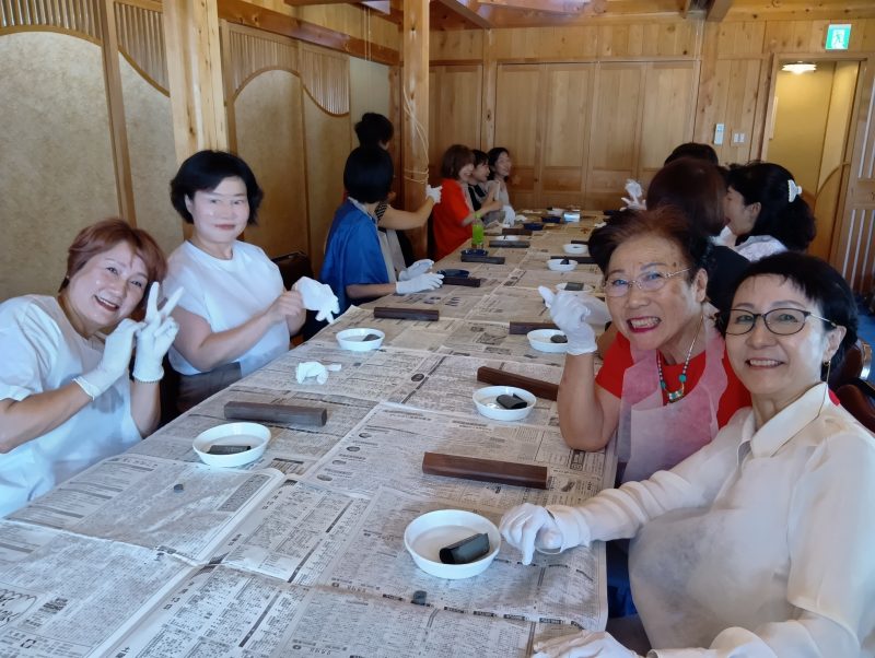 参拝のあとは那智黒石磨き体験。みなさま一生懸命紙ヤスリで擦っていました。出来上がった自分の作品を、これまたワイワイと見せ合いながらお喋りは止まりません。