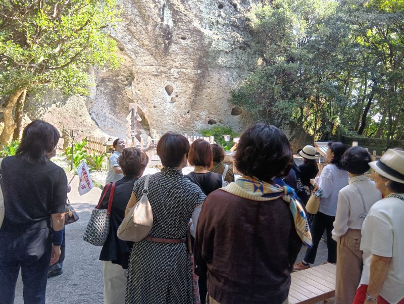 花の窟神社へ到着。熊野商工会議所女性部の方々が出迎えて下さり、神社案内と那智黒石磨き体験を案内頂き、楽しく交流させて頂きました。