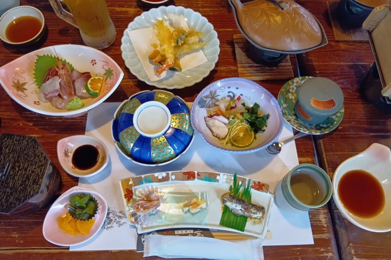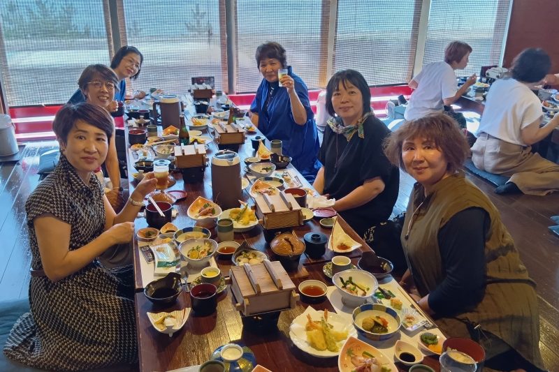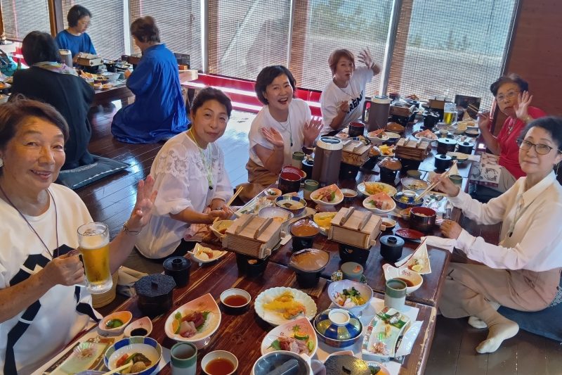 昼食は「花のいわや亭」で。海の幸、山の幸をふんだんに、豪華でおいしく、お腹いっぱいになりました。みなさま完食です。